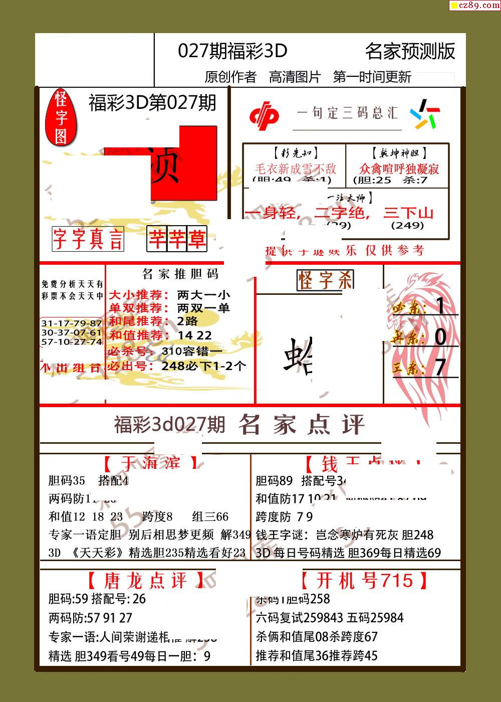 首页 > 福彩3D图谜 > 26年027期福彩3d牛彩名家预测图谜